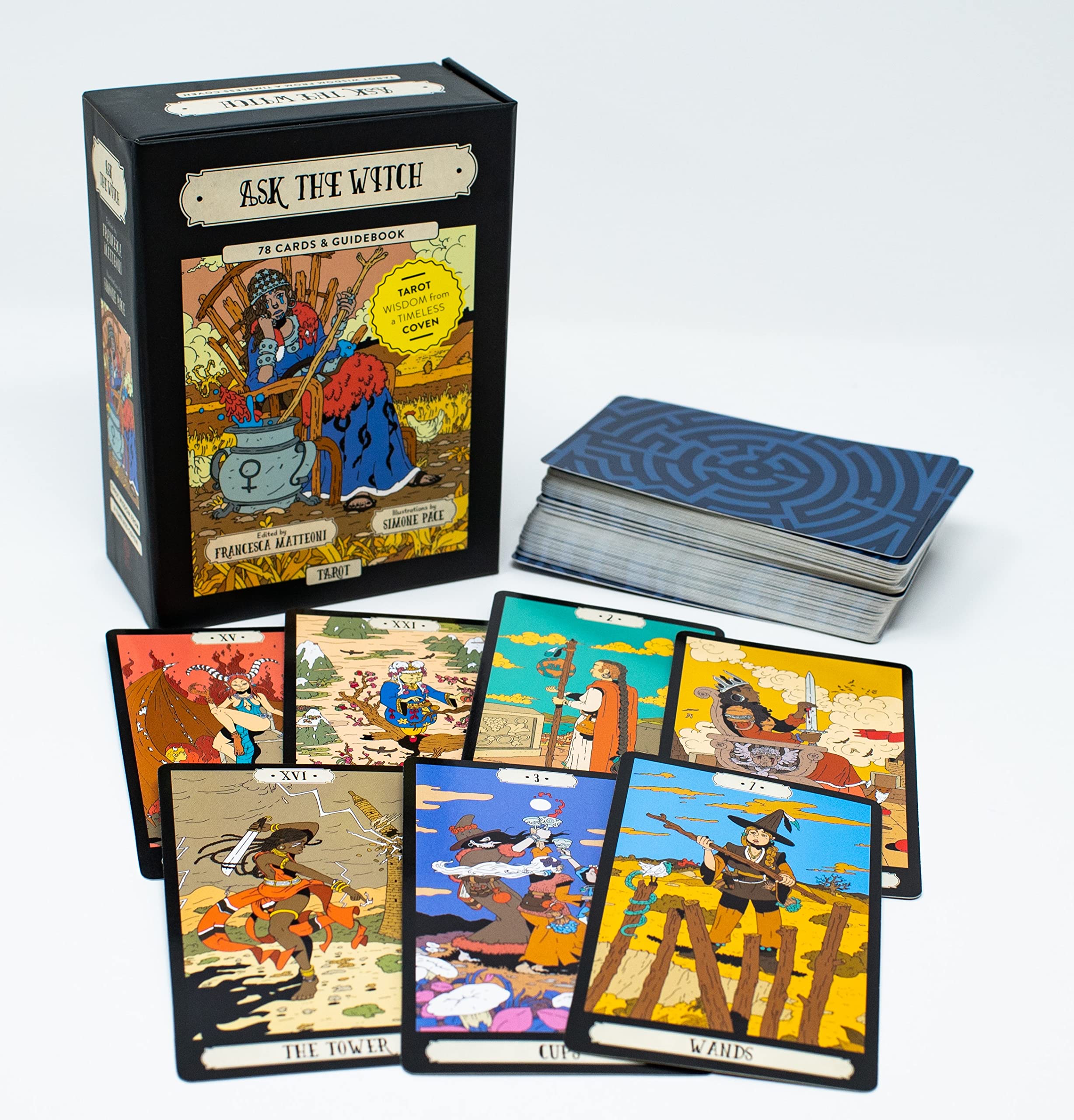 The Major Arcana is transformed as each card introduces readers to famous witches throughout history, literature, and mythology. They encompass sage crones, ancient fairies, and historical women who spoke out and stood their ground. In the Minor Arcana, witches, their tools, and magical animals are divided into categories that correspond to the four elements of fire, water, air, and earth. Samples include:I The Magician – Circe