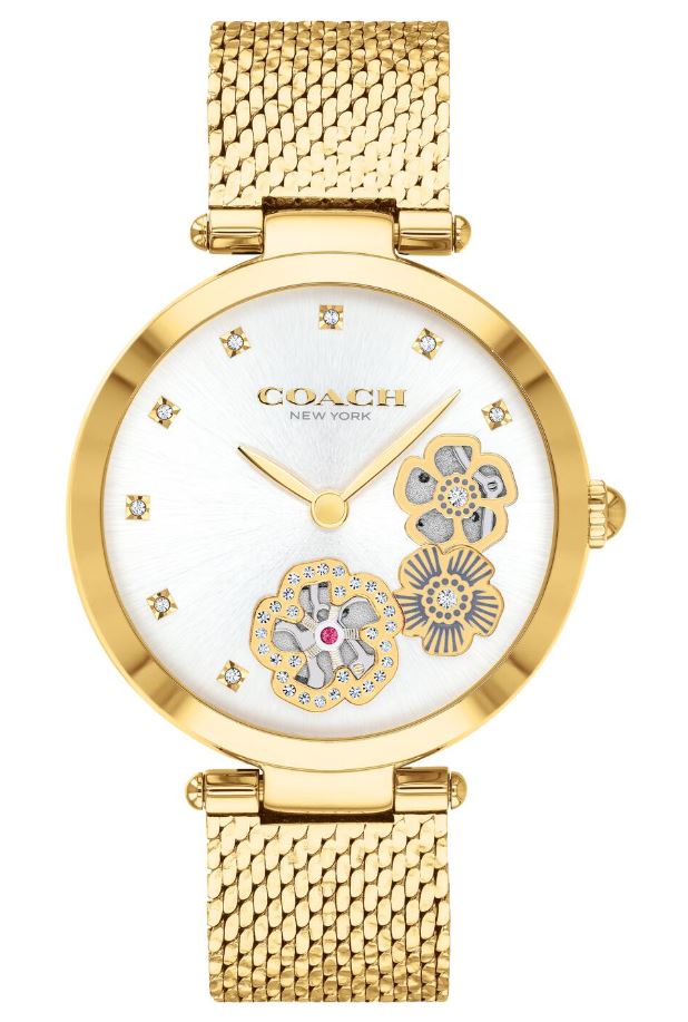Named for the glamorous New York City Street, the Park watch is an elegant style perfect for day or night. Finished with a sleek mesh bracelet, this gold tone design features Coach’s prairie-inspired Tea Rose motif and sparkling crystals markers. Stainless-Steel 34mm case and mesh bracelet. 3 ATM Water Resistance.