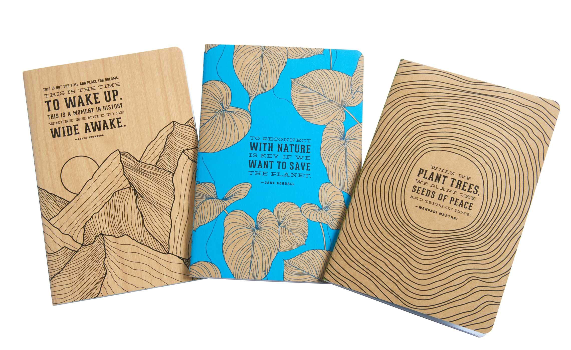 Drawing inspiration from the wisdom of leading conservationist and environmentalist Greta Thunberg, Jane Goodall, and Wangari Maathai, this set of three notebooks is a reminder to reconnect with nature and act on behalf of all living things and the planet we share. This set features one wood-paper covered notebook and two eco-friendly kraft paper notebooks with 64 lined pages each. All three notebooks feature responsibly forested FSC paper.