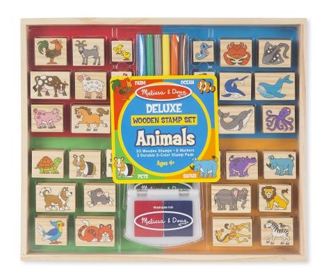 Create colorful scenes filled with adorable and exciting animal adventures with this 38-piece deluxe wooden animal stamp set! Choose from four colors of washable ink (red/blue and green/brown) to stamp animals, then color in and add details with six vibrant markers. Stamps include farm animals, ocean creatures, safari animals, and pets. With an abundance of animals to choose from, this set is perfect for creating art projects, cards, decorating notebooks, and more. All materials store neatly in a wooden crate. Wooden stamps help kids four and older develop hand-eye coordination and encourage storytelling and imaginative play.