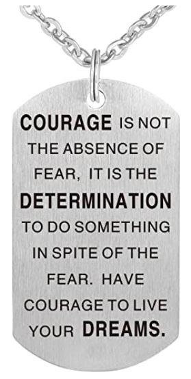 Courage is not the absence of fear, it is the determination to do something in spite of the fear. Have courage to live your dreams. Meticulous workmanship stainless steel Pendant, thick, three-dimensional, excellence showing the exquisite texture. Laser Engraved and handmade into a beautiful necklace for your Son, Daughter, Grandson, Granddaughter, Husband, Boyfriend, Girlfriend, Wife. Pendant Size: 1.96″(50mm) *1.1″(28mm). Key Ring Diameter: 28mm,Weight: 30g � Includes Pendant, Chain, and a black velvet bag.