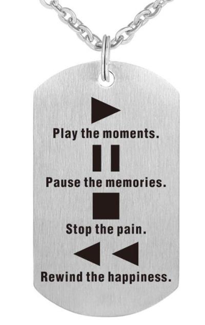 Play the moments. – Pause the memories. – Stop the pain. – Rewind the happiness. The design is laser engraved onto a Stainless Steel pendant that is thick and three-dimensional. Surface shows great… [more below]