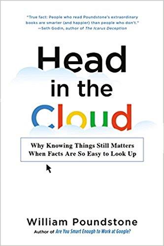 The real-world value of knowledge in the mobile-device age. More people know who Khloe Kardashian is than who Rene Descartes was. Most can’t find Delaware on a map, correctly spell the word occurrence, or name the largest ocean on the planet. But how important is it to fill our heads with facts? A few keystrokes can summon almost any information in seconds. Why should we bother learning facts at all? Bestselling author William Poundstone confronts that timely question in HEAD IN THE CLOUD. He shows that many areas of knowledge correlate with the quality of our lives–wealth, health, and happiness–and even with politics and behavior. Combining Big Data survey techniques with eye-opening anecdotes, Poundstone examines what Americans know (and don’t know) on topics ranging from quantum physics to pop culture. HEAD IN THE CLOUD asks why we’re okay with spelling errors on menus but not on resumes; why Fox News viewers don’t know which party controls Congress; why people who know “trivia” make more money than those who don’t; how individuals can navigate clickbait and media spin to stay informed about what really matters. Hilarious, humbling, and wildly entertaining, HEAD IN THE CLOUD is a must-read for anyone who doesn’t know everything.