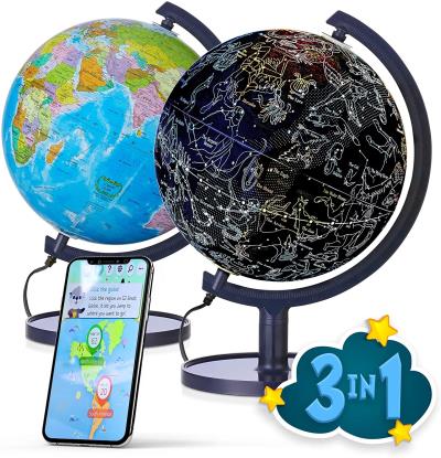 10� Interactive Smart Globe with Educational “Click Word Atlas” app for iPad, iPhone and android phone. LED Starry globe showing 88 constellations, zodiac signs and Milky Way. Fine Geographic World Globe: Detailed globe depicting mountain ranges, ocean currents, deserts, lakes, state capitals and major cities. Interactive App Content featuring fun yet educational topics about countries around the world coupled with text, sound & captivating visuals. Easy to assemble!