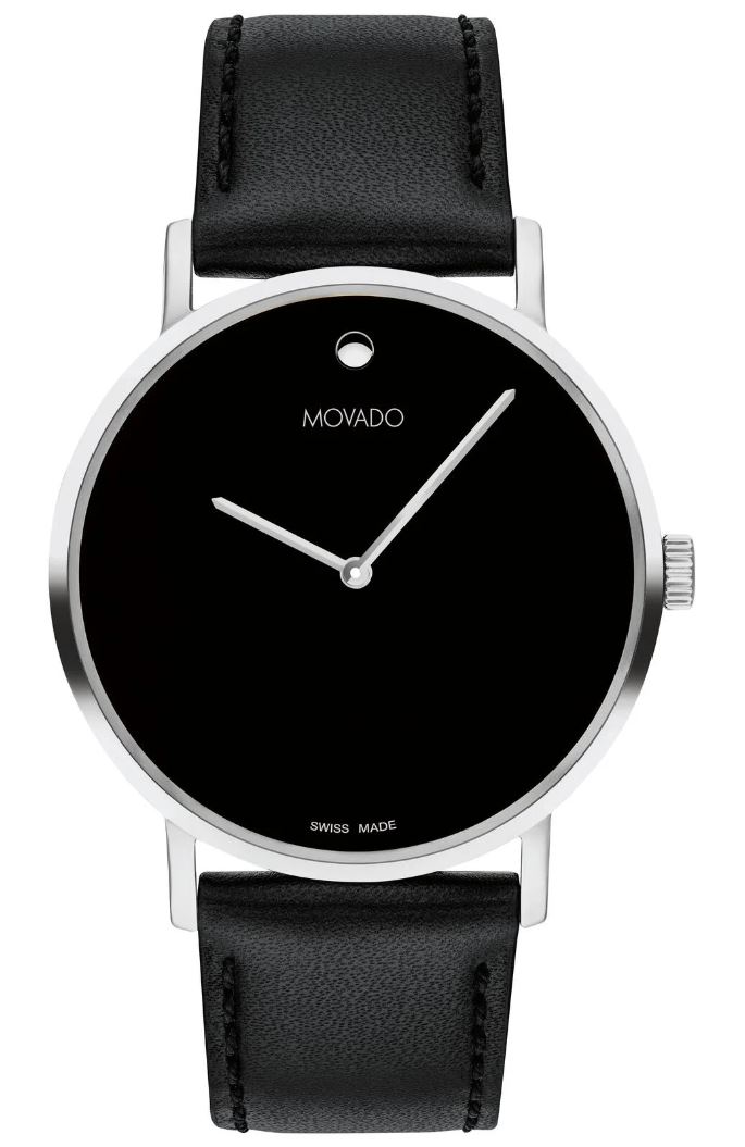 An icon of modern design, the Movado Signature watch features a 40mm yellow gold PVD stainless steel case, a black dial, and a black leather strap. Unisex, Men?s, Women?s. Water Resistance: 30 Meters
