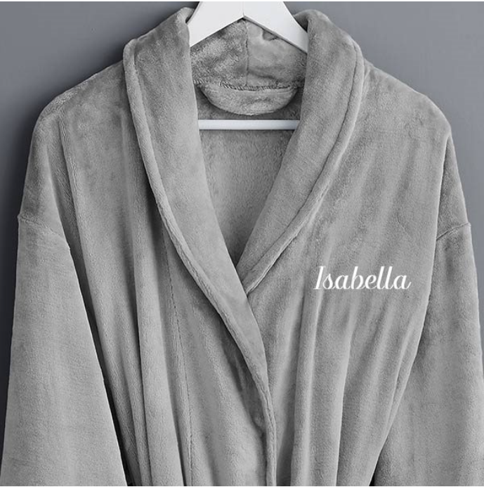 ***LIST PERSONALIZATION DETAILS IN THE SHIPPING INSTRUCTIONS DURING CHECKOUT*** (1 LINE: Max # of Characters for the name is 11). Super soft luxurious Classic Comfort Personalized Luxury Fleece Robes are always a favorite! For bedroom, bath or casual lounging, wrap yourself in pure comfort! Kimono-style robe features two over-sized front pockets, double needle assembly, and over-sized 3/4 length cuffs for extra comfort. Quality made of 100% polyester, falling at mid-calf length, grey robe approx. 47″LONE SIZE FITS MOST: Men?s: fits up to size Large (52-54″ chest) Women?s: fits up to XL (18-20)