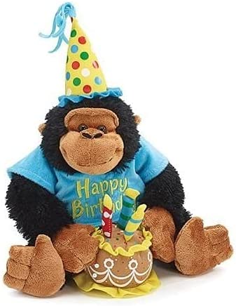 Black and brown monkey wearing a blue tee shirt with “Happy Birthday” embroidered on it. Monkey is holding a cake with 3 candles on top. Musical chip in cake that plays Happy Birthday…. [more below]