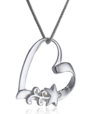 This sterling silver pendant brings a fun twist to the classic open-heart design with a shooting star accent. Resting along the bottom of an included 18-inch box chain is a classic open-heart shaped p… [more below]