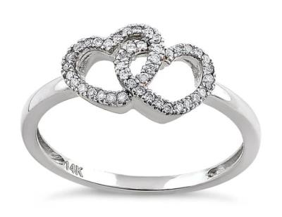 White Double Heart Diamond Ring -Solid 14K White Gold